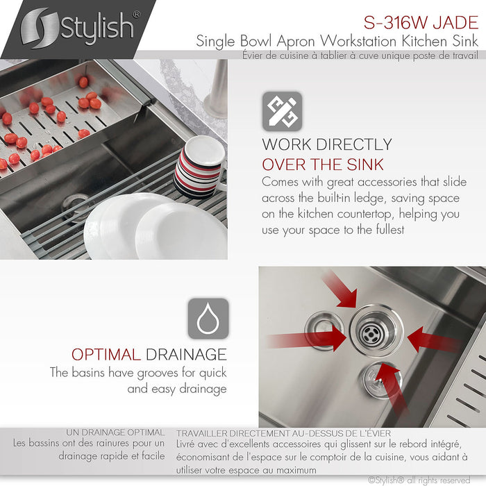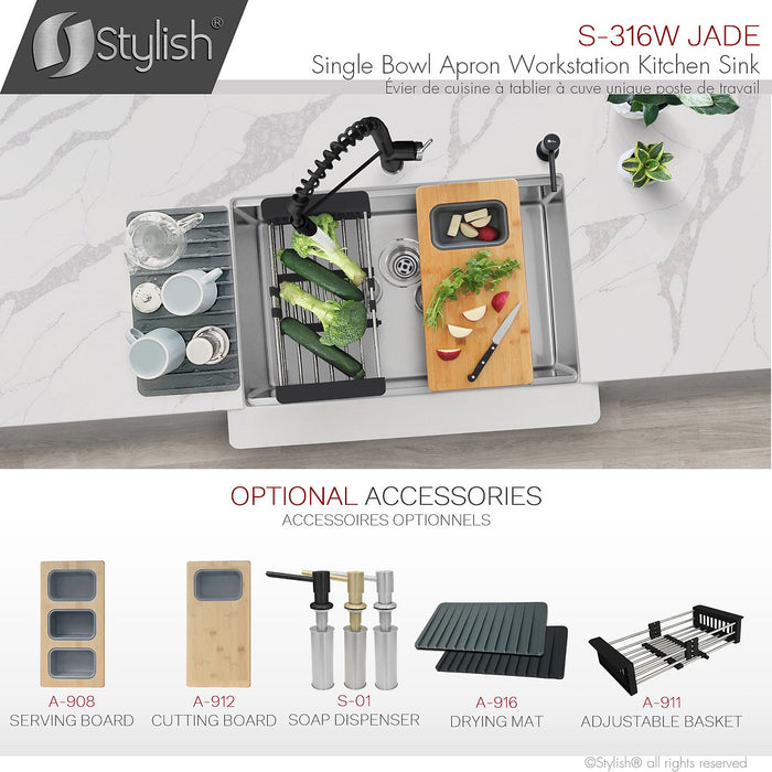 Stylish 30" JADE S-316W Farmhouse Single Bowl Stainless Steel Apron Kitchen Sink with Accessories