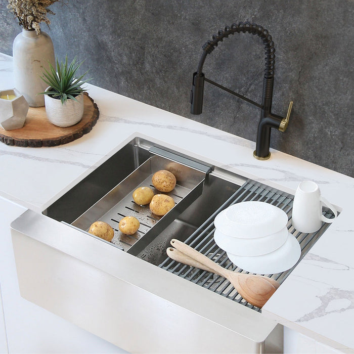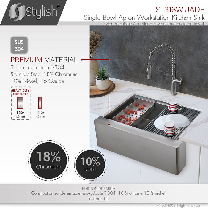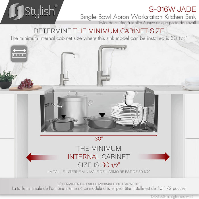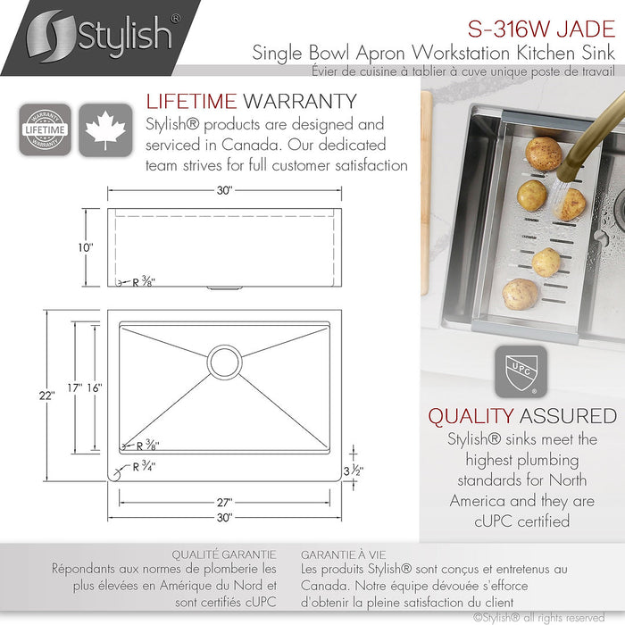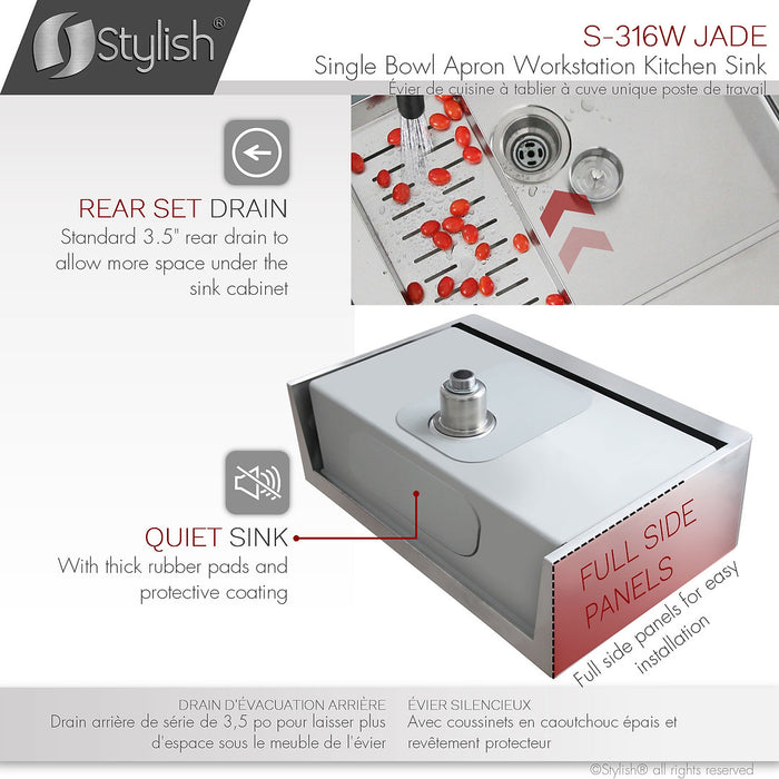 The Stylish 30" JADE S-316W Farmhouse Single Bowl Stainless Steel Apron Kitchen Sink with Accessories brings modern functionality and timeless design to your kitchen. This 30 x 22-inch single-bowl sink is crafted from premium 16-gauge stainless steel, offering durability and elegance. Its 10-inch deep bowl provides ample space for washing large pots and pans, while soundproofing technology with a protective stone guard and rubber pads minimizes noise and vibration. The rear-positioned drain optimizes under-sink storage, and the sleek 10mm radius corners make cleaning effortless. With dual-mount installation options, compatibility with standard garbage disposals, and a limited lifetime warranty, this cUPC-certified sink is the ultimate choice for home chefs looking to enhance their kitchen with style and efficiency.