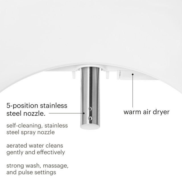 Brondell Swash DR802 Advanced Bidet Toilet Seat with Remote Control delivers a premium hygiene experience with luxury features designed for comfort and convenience. This modern bidet seat fits elongated or round toilets and offers a customizable clean through a stainless steel, self-cleaning nozzle with multiple wash modes. Enjoy a warm water wash, an adjustable heated seat, a gentle warm air dryer, and a carbon deodorizer to keep your bathroom fresh. Its intuitive wireless remote control is programmable for two users, making personalized cleansing effortless. With eco-friendly benefits and easy installation, it’s a sustainable upgrade your bathroom deserves.